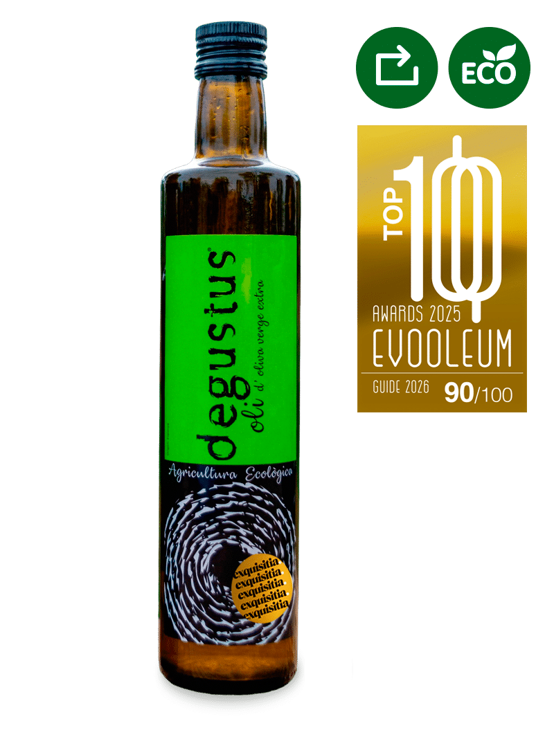 Degustus Ecológico ha sido reconocido en el EVOOLEUM TOP100 como uno de los mejores aceites del mundo. Un AOVE arbequina procedente de agricultura ecológica, con autenticidad territorial y carácter fresco.