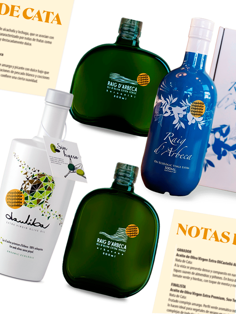 La selección reúne cuatro aceites radicalmente distintos, elaborados por productores de referencia de Lleida como Raig d’Arbeca, acompañados de un tarjetón impreso con notas de cata para guiar la experiencia paso a paso.
